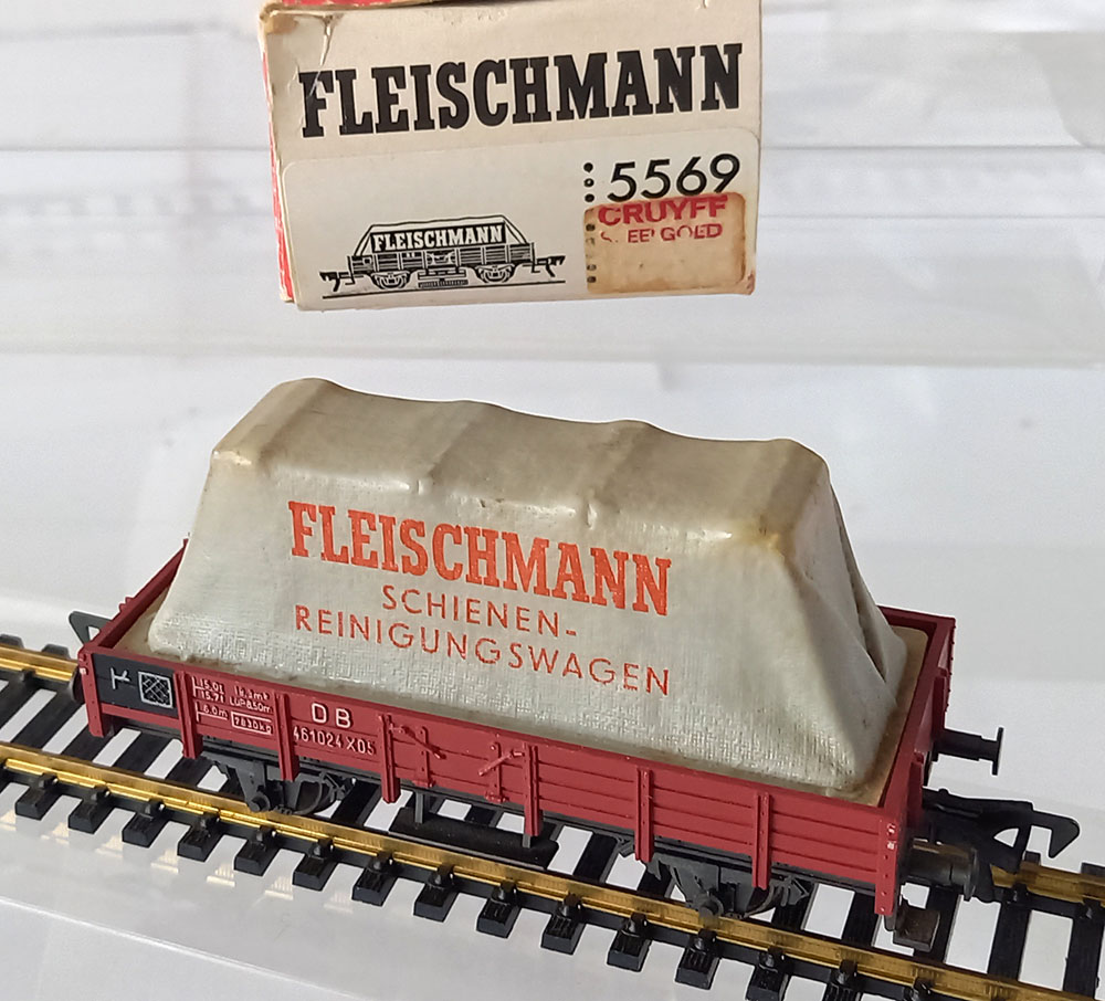 met opschrift 'Fleischmann" (N.B.: dit is geen railreinigingswagen). Huif wat smoezelig, 1 step missend, verder goede staat. In verpakking met verkeerd nummer.