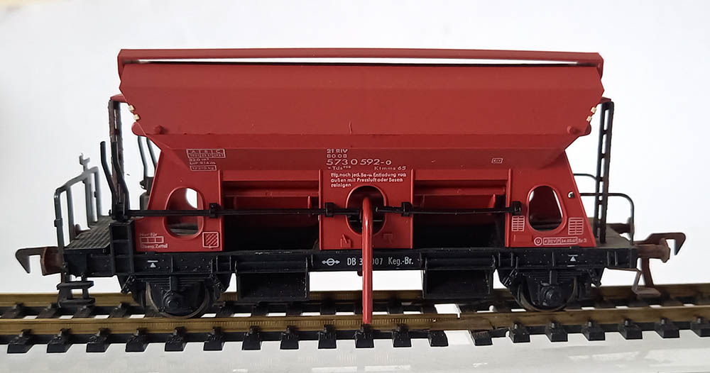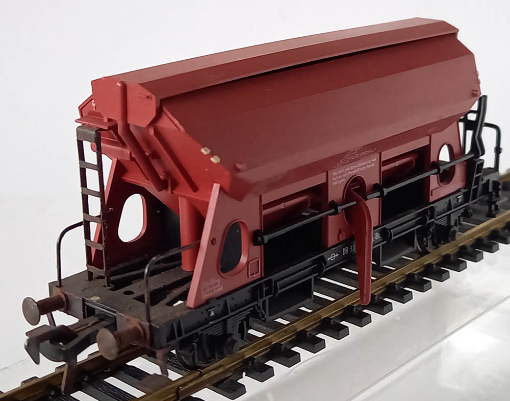van de Duitse Spoorwegen met zwenkdak en 4 beweegbare afsluiters in de wagenvloer voor het automatisch lossen van stortgoed. Haakkoppeling. Goede staat.