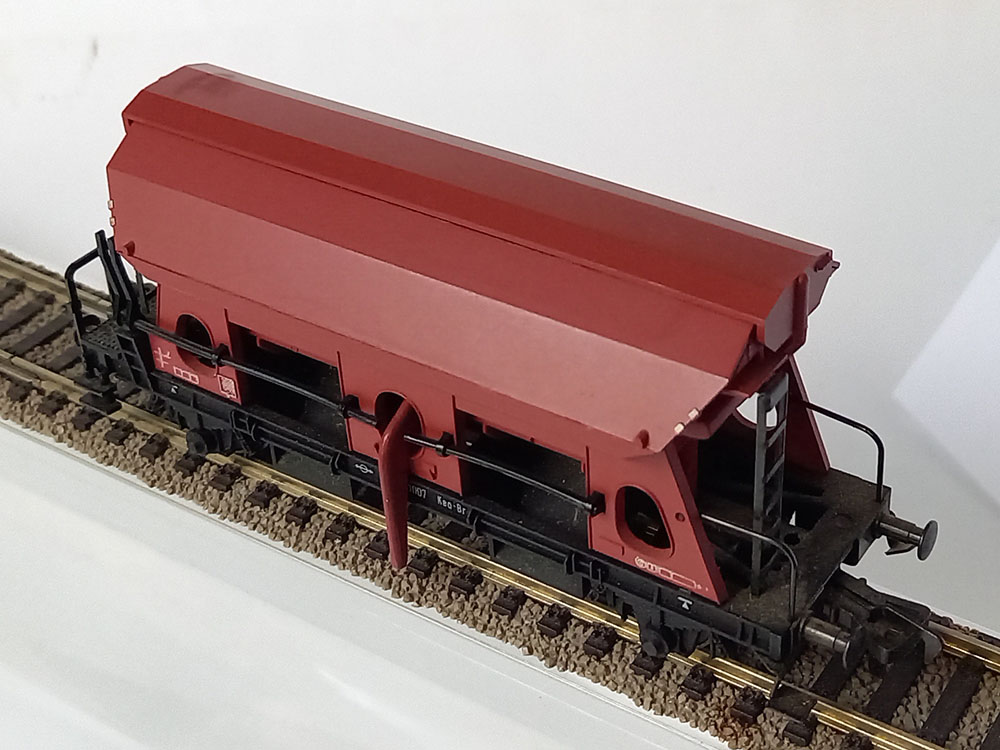 Roodbruine zelflosser van de Duitse Spoorwegen met zwenkdak en 4 beweegbare afsluiters in de wagenvloer voor het automatisch lossen van stortgoed. Haakkoppeling. Uitstekende staat.