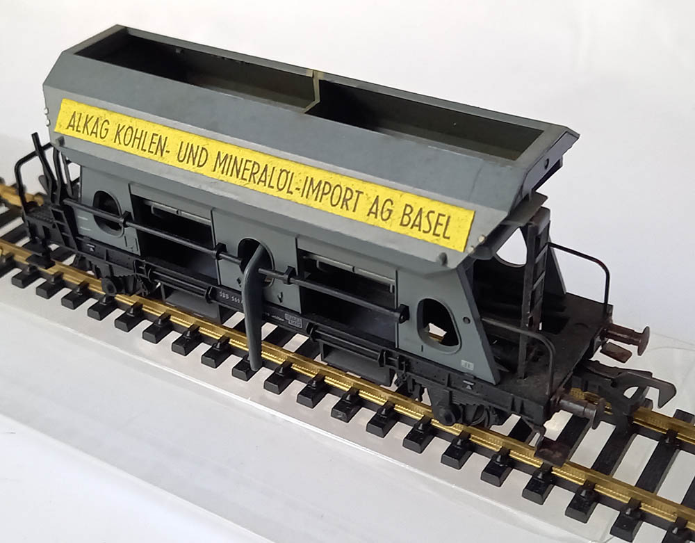 Zelflosser van de firma "ALKAG" in Basel. Voorzien van 4 beweegbare afsluiters in de wagenvloer voor het automatisch lossen van stortgoed. Grijze SBB uitvoering met originele opschriften. Haakkoppeling. Compleet maar smoezelig.