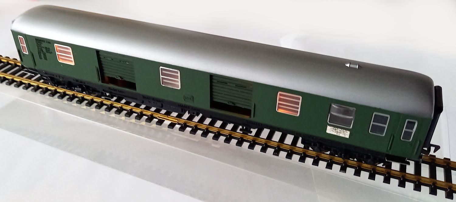 model type Düm van de Duitse Spoorwegen, ingezette ramen, beweegbare rolluiken. verlichting aanwezig. 245 mm. Uitstekende bijna nieuwwaardige staat. Gebouwd uit bouwpakket, dus geen witte opschriften.