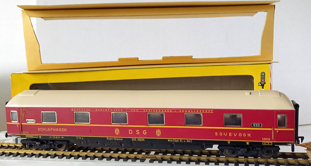 slaapwagen 1e/2e klasse type WLAB4üm van de DSG, beide zijden niet identiek, lengte 245 mm. Voorbereid voor binnenverlichting. Etiketten met koersen bijgevoegd. nieuwwaardige staat in originele verpakking.