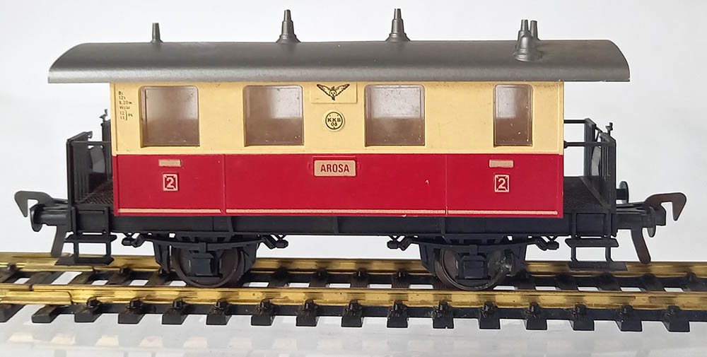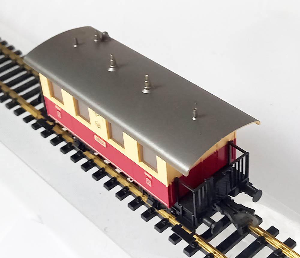 2e klasse, creme/rood. Model naar het voorbeeld van vele privespoorwegen. Lengte 105 mm. Met binneninrichting, ingezette en geopende ramen met imitatiehandgrepen. Uitstekende staat.