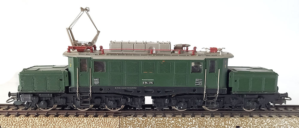goederentreinlocomotief. Bouwserie E94 van de Duitse Spoorwegen, 6-assig, 3 assen aange-dreven, schakelt prima zonder weg te springen, voor- en achter 3 verlichte koplampen waarvan 1 zijde niet brandt, 3-delige metalen bovenbouw. Lengte 21 cm. De loc verkeert optisch in zeer goede staat, maar mist 1 pantograaf. Wij leggen 1 panto bij die helaas ook niet geheel in orde is. De loc mist zijn antislip-banden maar rijdt desondanks prima. Gezien dat u er nog wat werk aan heeft houden we daar met de prijs rekening mee.