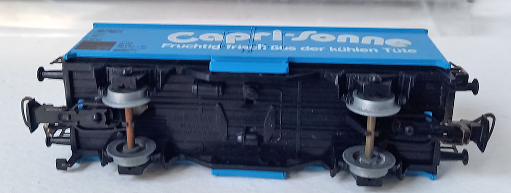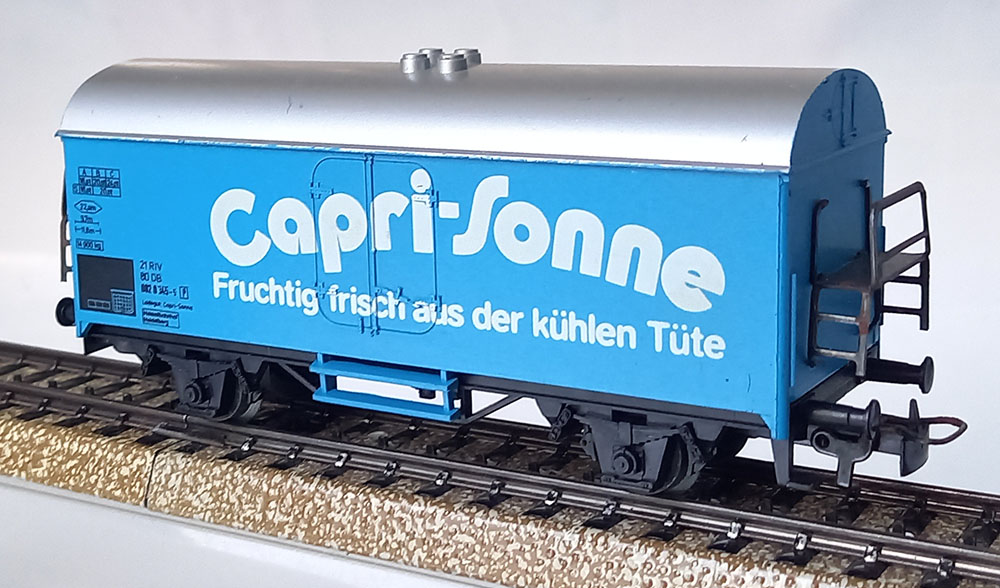 goederenwagen, kunststof, lichtblauw, met opschrift "Capri-Sonne", Wagennr. 082 2 345-5. Uitstekende staat, maar wielasjes roestig.