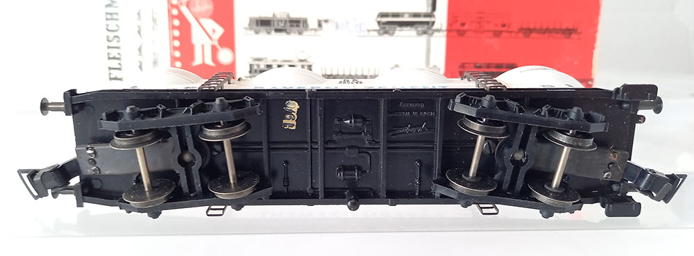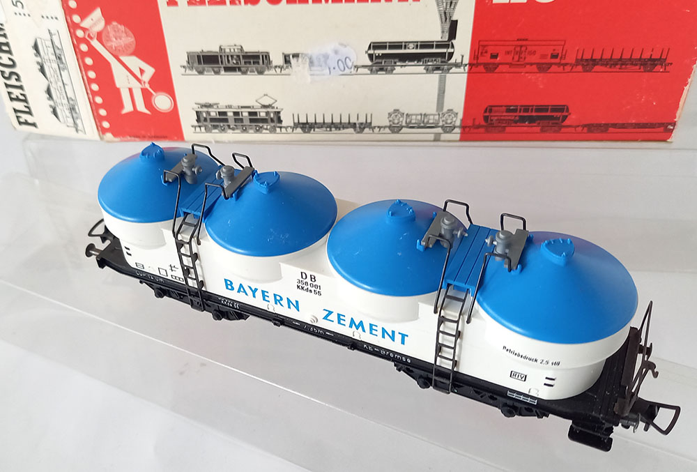 4-assig, met opschrift "Bayern Cement”, type KKds 55 van de DB voor perslucht lossing. Lengte 170 mm. Uitstekende staat in originele verpakking, weliswaar een Fleischmannwagen, maar voorzien van beugelkoppelingen..