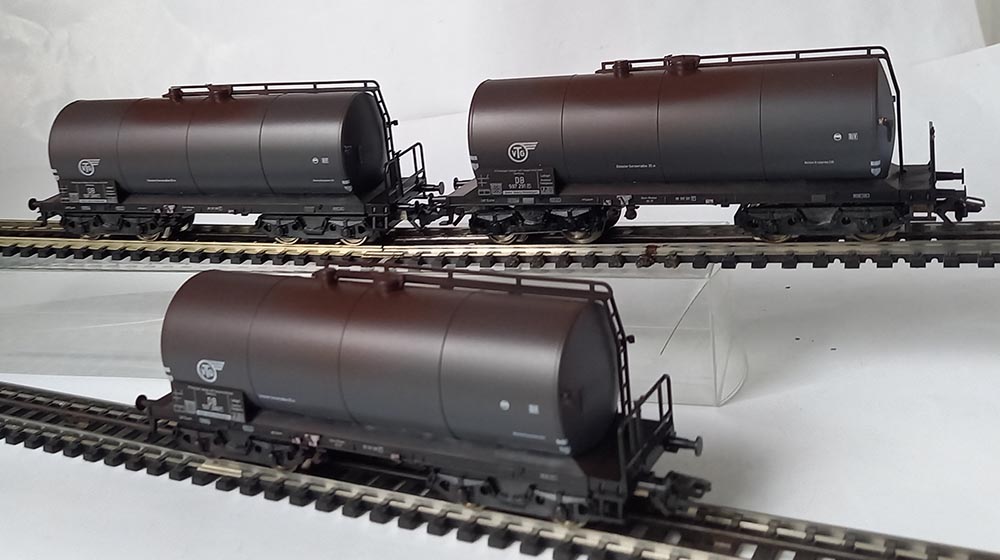 met 3 Vierassige ketel-wagens 'VTG' van de Duitse Spoorwegen. Märklin koppelingen, brede wielen, epoche III. Wordt geleverd nieuwwaardig (of nieuw) in originele verpakking.