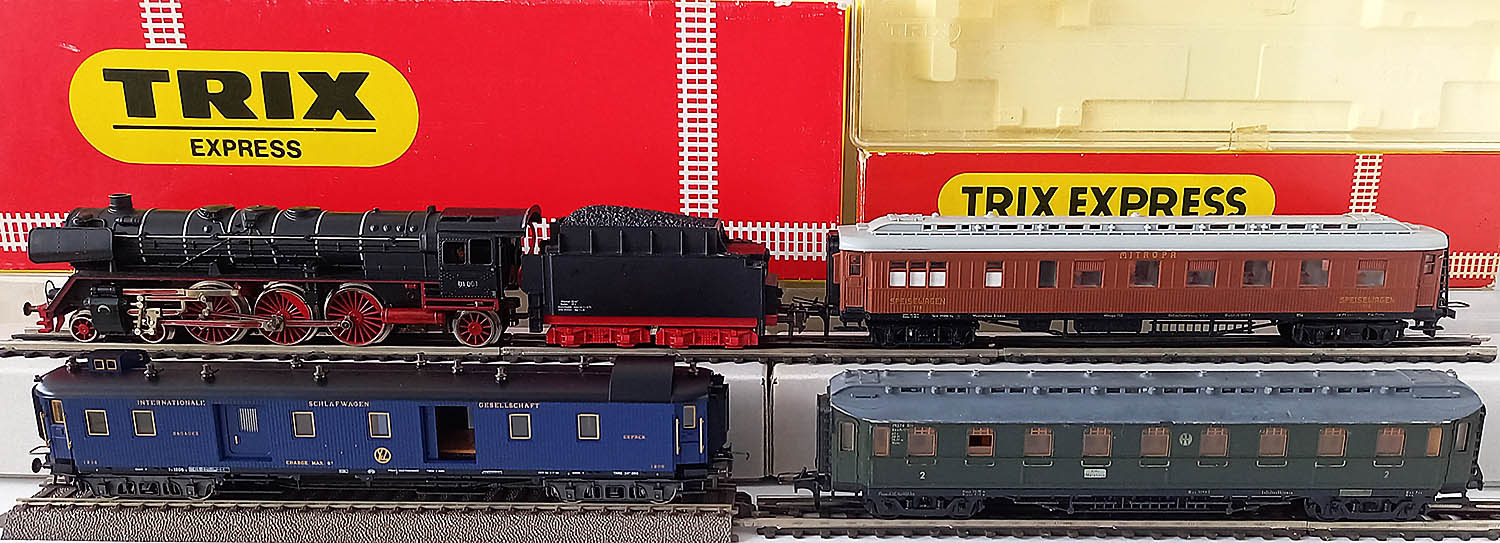 te weten een restauratierijtuig, baggagewagen en personenrijtuig. Mooie set met goed rijdende loc (volmetaal) en 3 klassieke wagons. Het groene rijtuig is iets minder mooi, de rest is fantastisch. Het blauwe baggagerijtuig heeft binnenverlichting, maar daarvan is een sleper los.