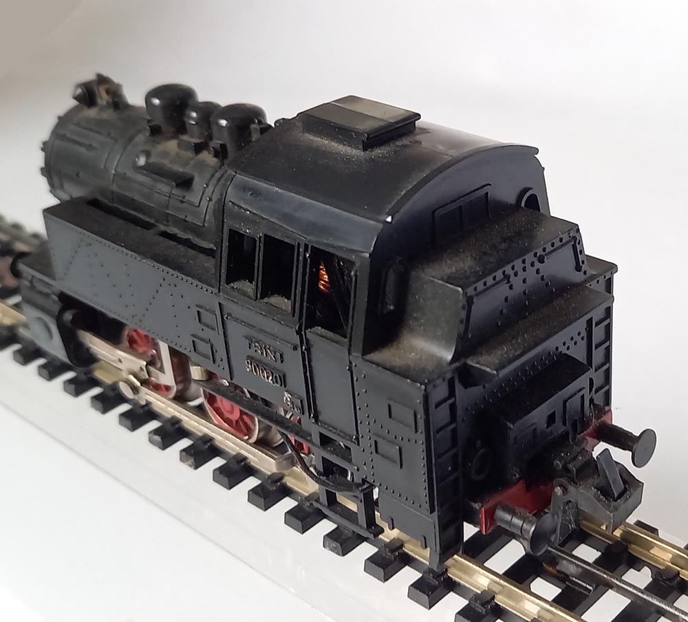 2210 Rangeer tenderloc BR80 voor 3-rail gelijkstroom, 3-assen aangedreven, 3 koplampen voor, kunststofuitvoering, lengte 11 cm. Gewicht ca. 160 gram. Goede staat maar schoorsteen ontbreekt.
