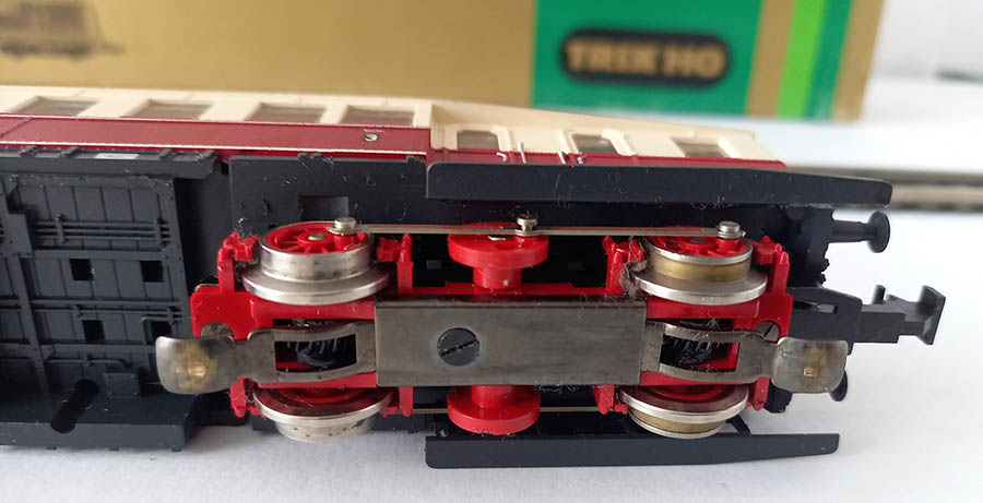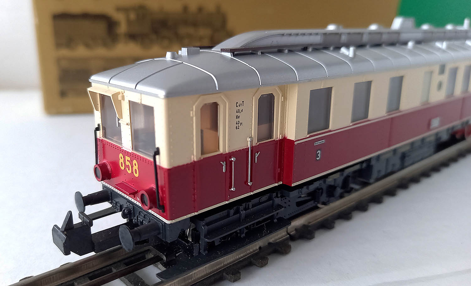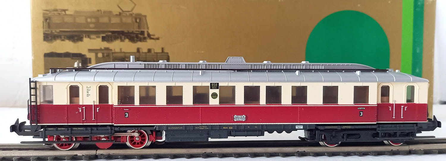 van de Deutsche Reichsbahn bedoeld voor de lokaalbaan in de 30-er jaren, epoche II, 3-rail gelijkstroom, analoog, rood/creme, frontverlichting wisselend met de rijrichting en binnenverlichting. Getest. Uitstekende staat in originele verpakking met gebruiksaanwijzing.