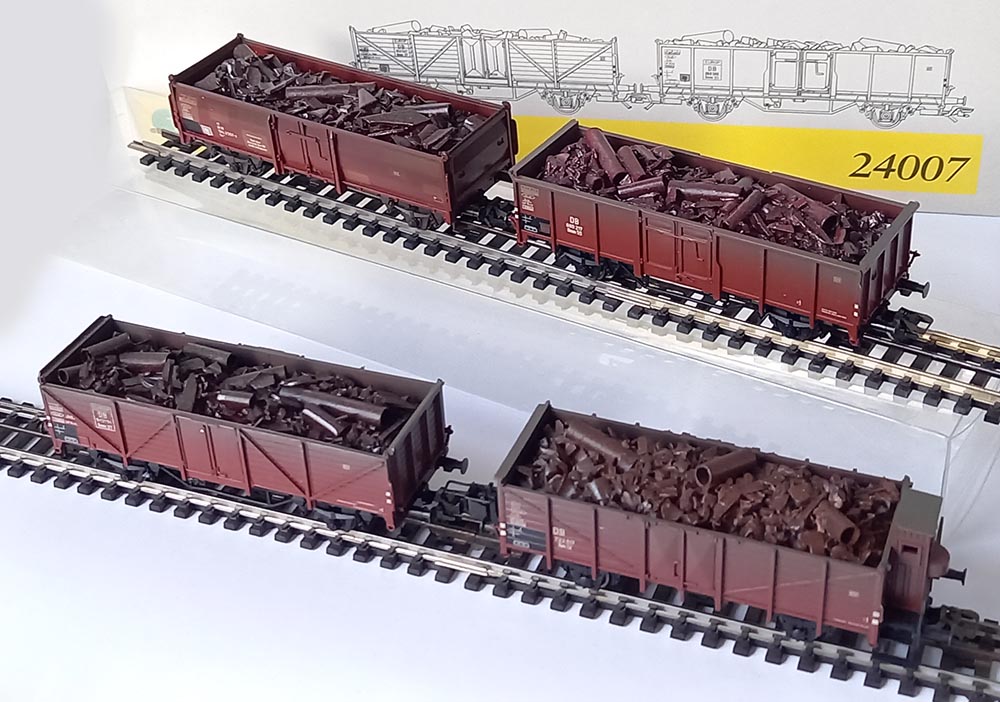 naar de volgende voorbeelden bij de Deutsche Bundesbahn: 1 Omm 52, 1 Om 12 met remmershuis, 1 Omm 37 met trekwerk, 1 Omm 55 met trekwerk. Alle 4 wagens gevuld met "schroot" en geweathered. Märklin koppelingen, brede wielen, epoche III. Wordt geleverd nieuwwaardig (of nieuw) in originele verpakking.