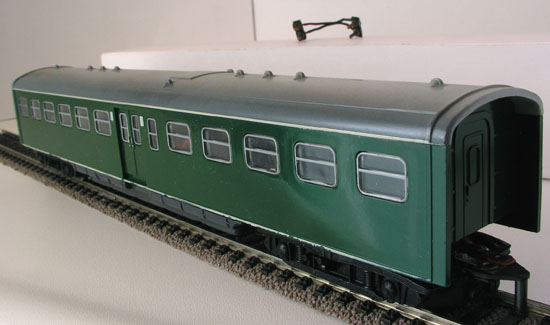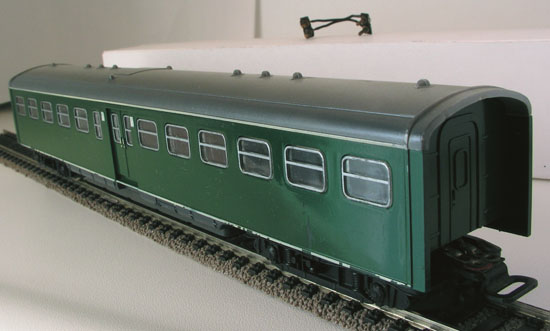 Tussenwagon ter aanvulling van het Trix hondekoptreinstel. Kleur groen. Kunststof. Voorzien van binnenverlichting. Vervangende verpakking. De wagon verkeert in goede staat. Ook de originele stekkertjes voor electrische doorverbinding ontbreken niet.