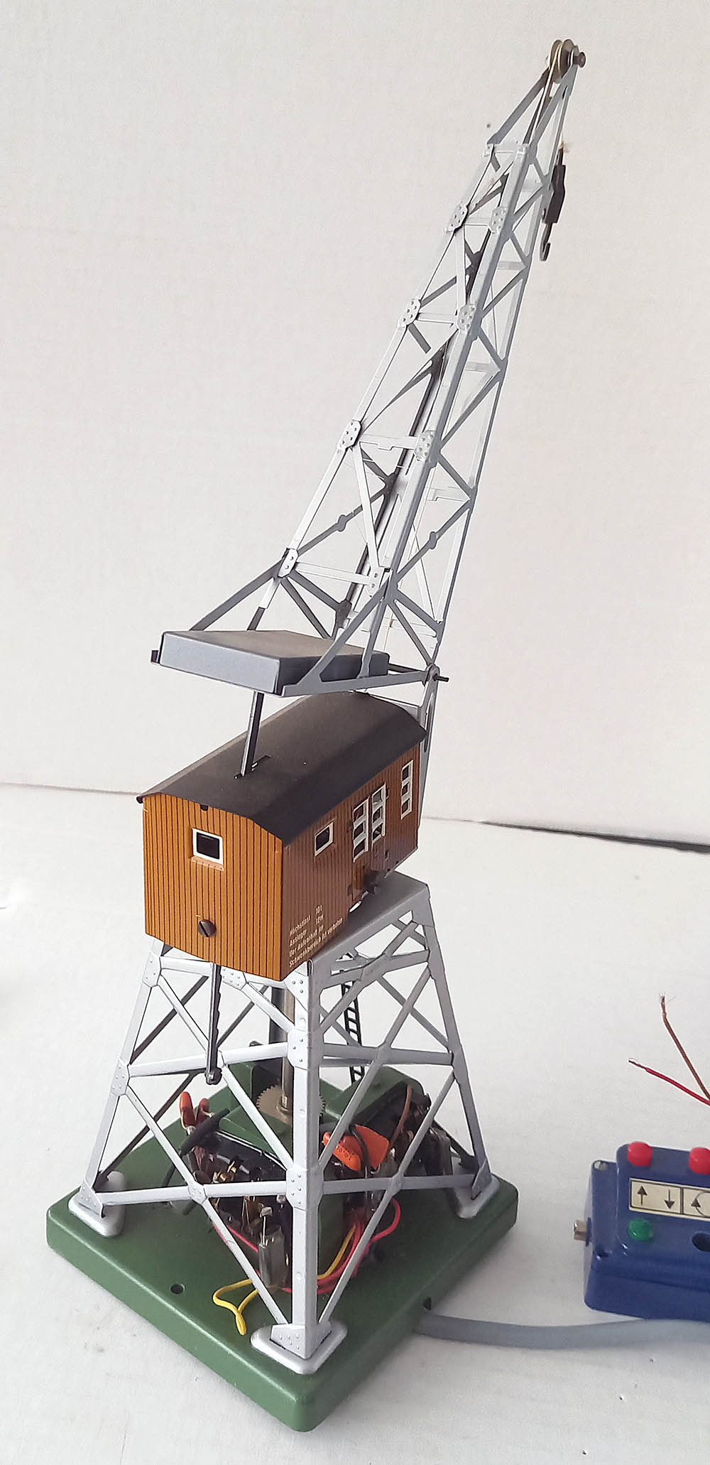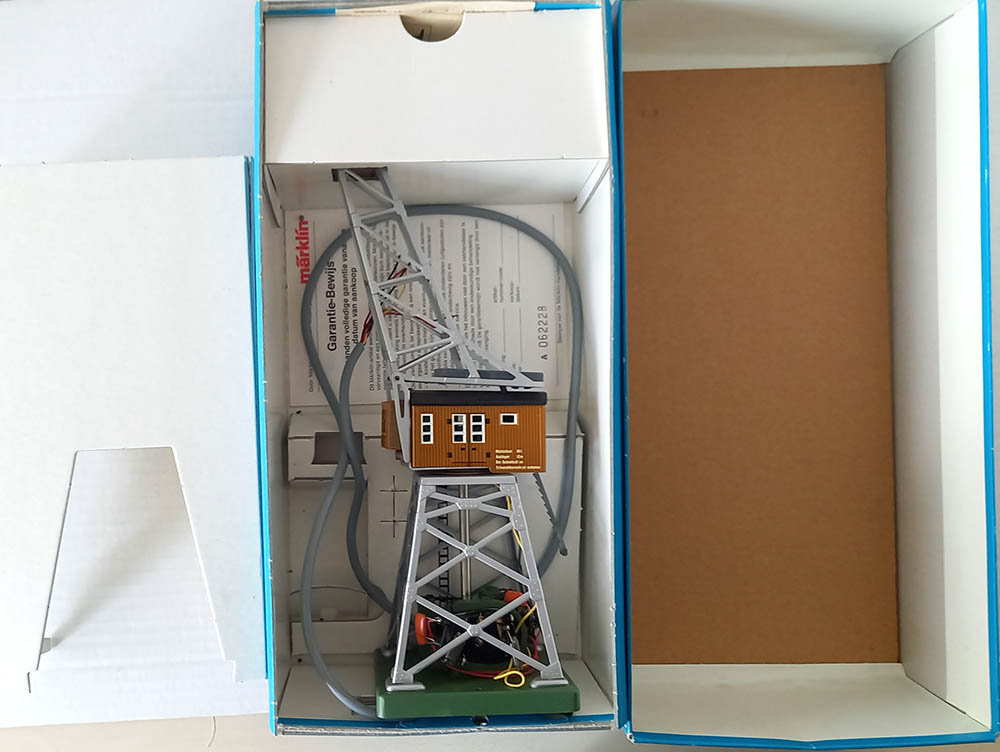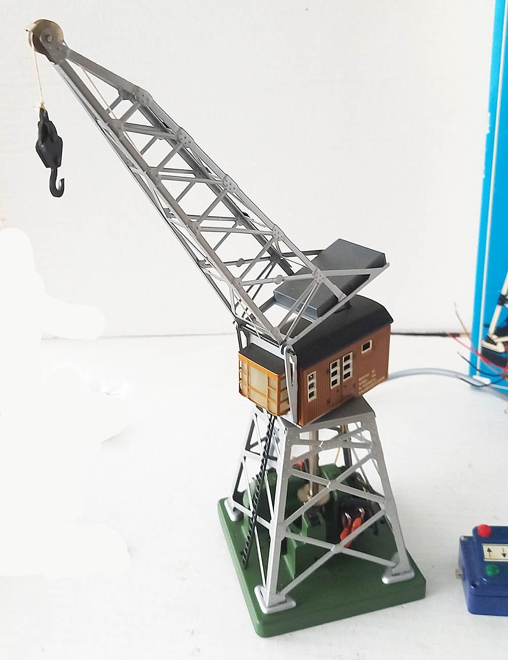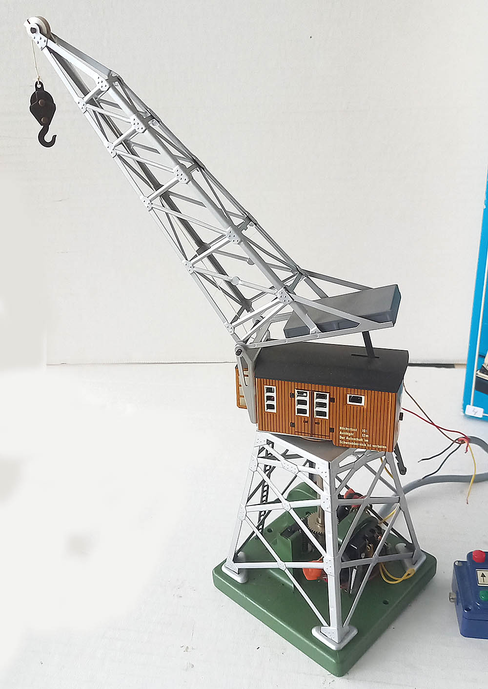 Type met geel/bruin kraanhuis, metaal, 2-motoren voor de functies draaien en heffen, zonder electromagneet, wel verlichting, bedieningskastje is open geweest, stekkertjes ontbreken, knoppen liggen er los in. De kraan is in nieuwstaat maar functioneert niet. Vermoedelijk is de olie in de motoren hard geworden waardoor er geen beweging is. De kraan wordt geleverd in de originele blauwe verpakking met gebruiksaanwijzing en is optisch in uitstekende staat.