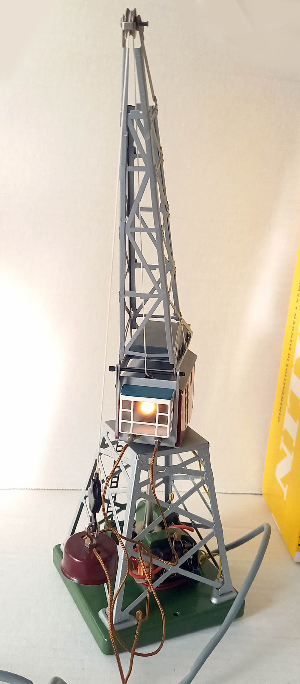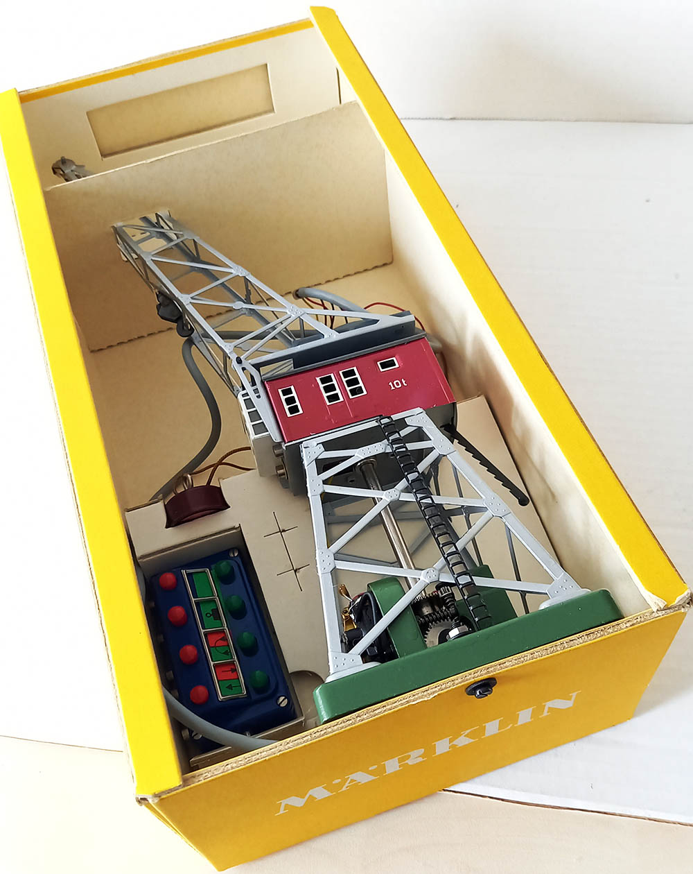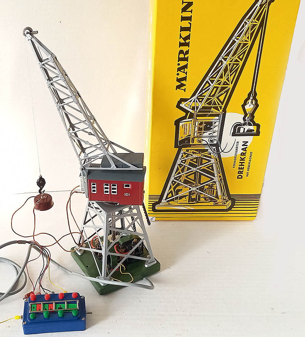 Oudere type met roodbruin kraanhuis, metaal, 2-motoren voor de functies heffen en draaien, met electromagneet, verlichting, bedieningskastje wat stroef. Alle functies getest. De kraan wordt geleverd in de originele gele verpakking + Gebruiksaanwijzing. Uitstekende staat. Produktie van 1956-1978.