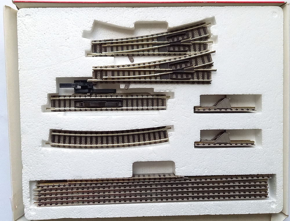5 rechte rails 9100, 1x9102, 1 ontkoppelrail 9114, 2 stootblokken 9116, 1 gebogen rails 6136, 2 wissels links voor handbediening 6171. Alles nieuw in de originele verpakking. De inhoud is niet helemaal kloppend met wat er in de set moet zitten (daar is met de prijs rekening mee gehouden), maar de inhoud is splinternieuw en dat is altijd fijn.