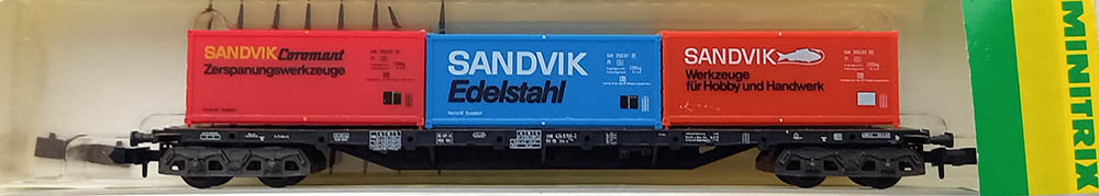 type Sss-y 716 van de Duitse Spoorwegen, 4-assig, zwart met 3 Containers met opschrift ´SANDVIK´ Epoche IV. Uitstekende staat in originele verpakking.