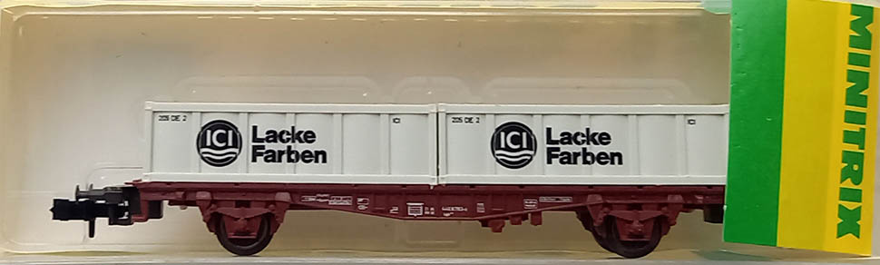 Type Lgjs 599 van de Duitse Spoorwegen, 2-assig, bruin, met twee 20´ platte containers (wit) met opschrift ´ICI Lacke Farben´. Epoche IV. Uitstekende staat in originele verpakking.
