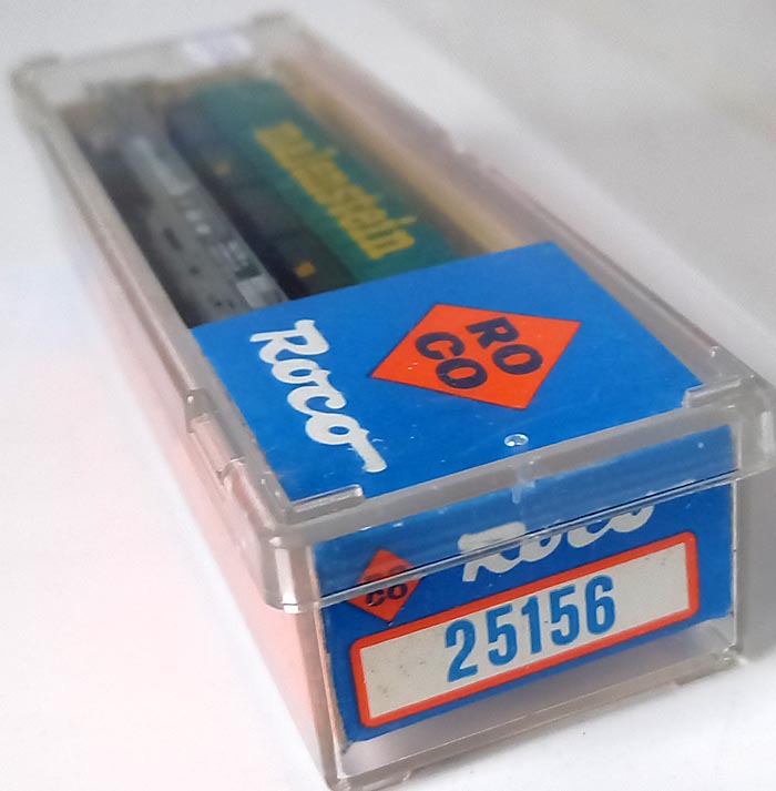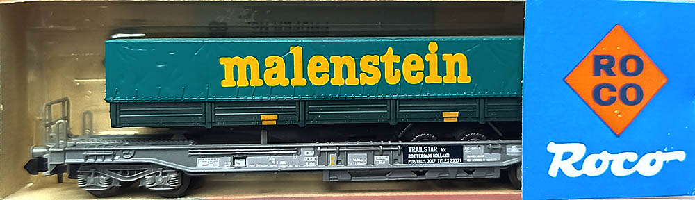 met oplegger groen/blauw/geel met opschrift 'malenstein', type Sdkmmss van de Nederlandse Spoorwegen, 4-assig, bruin lengte 103 mm, Epoche IV. Nieuwwaardig in originele verpakking.