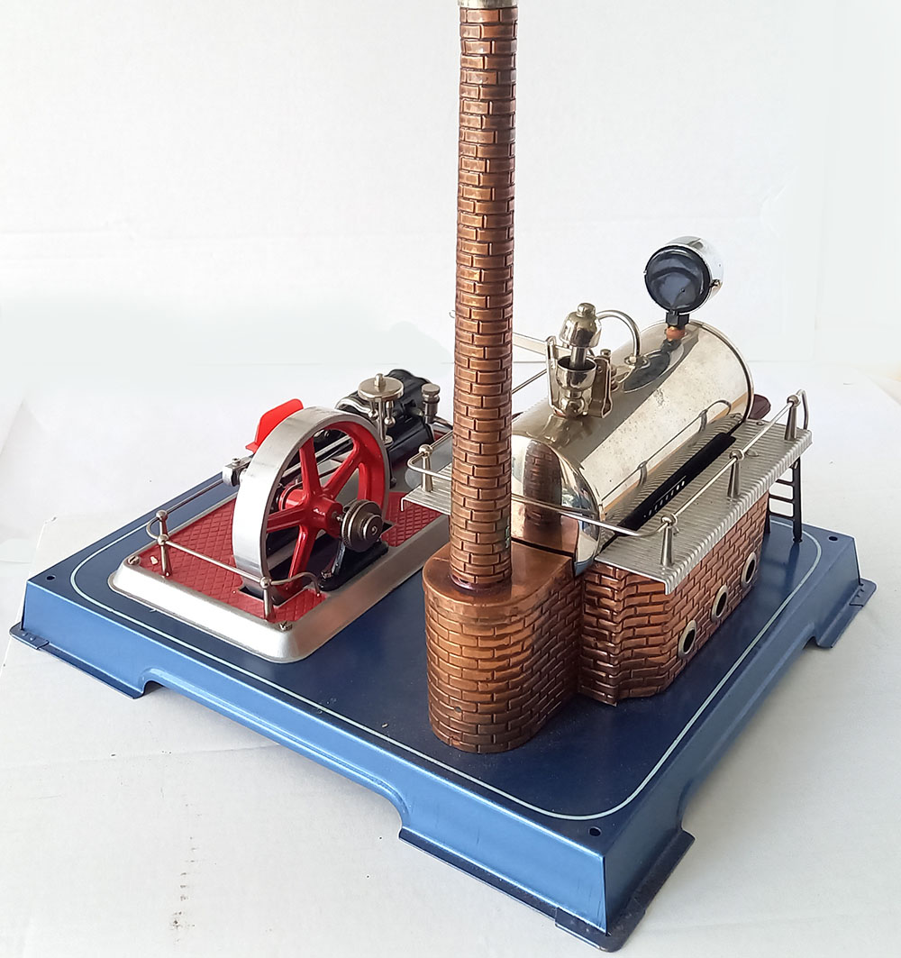 De dubbelwerkende, vaste messing cilinder van dit model stoommachine is voorzien van een vliegwiel dat in beide draairichtingen te bedienen is. De stoomdruk kan constant worden gecontroleerd via de manometer. Met de aftapkraan kan restwater uit de ketel verwijderd worden. Zoals u op een van de foto;s kunt zien is het kijkglas vervuild en moet waarschijnlijk schoongemaakt worden, met de prijs is hiermee rekening gehouden.