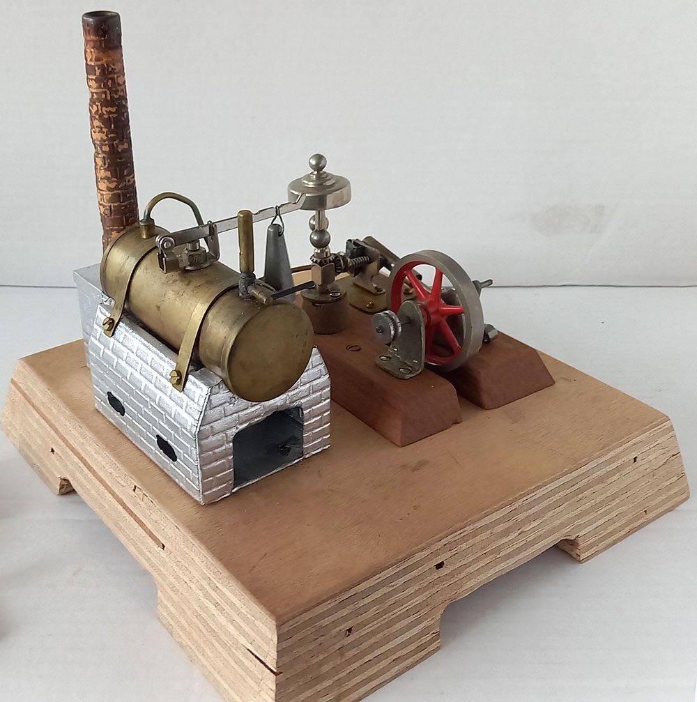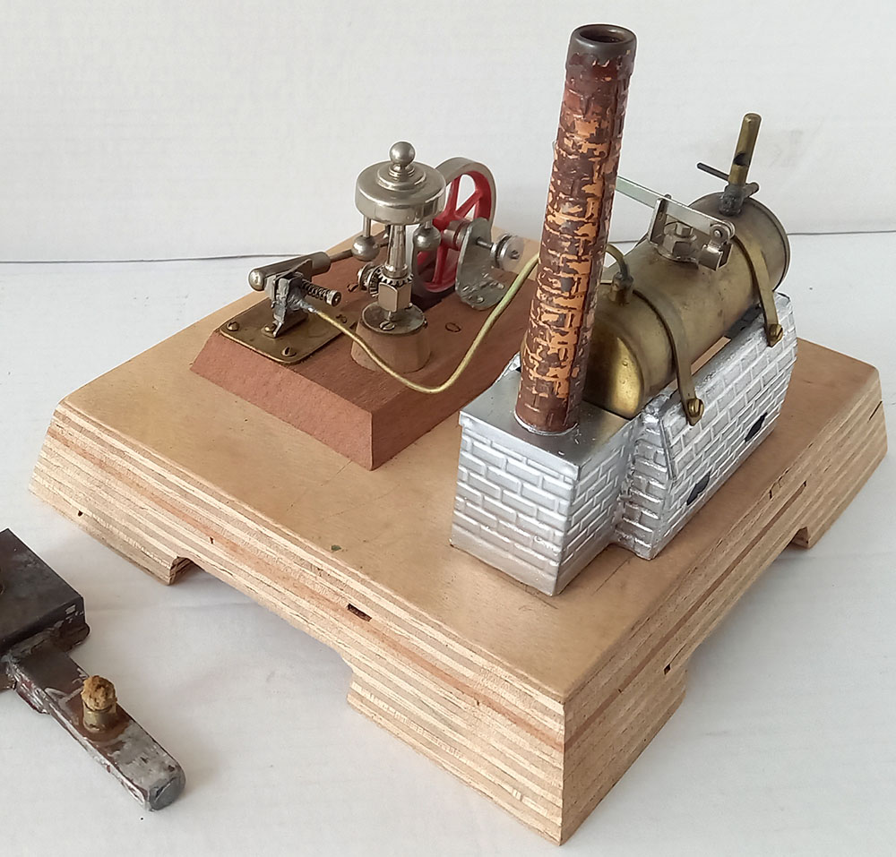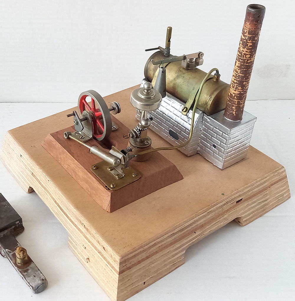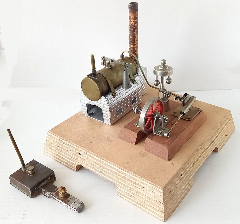 Stoommachine gebouwd op een stuk multiplex. Functie niet getest. Cilinderstang los. Daarbij een aantal onderdelen, zie foto.