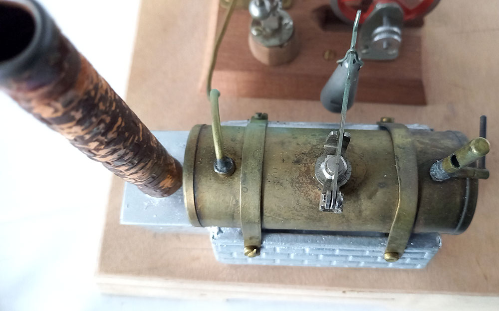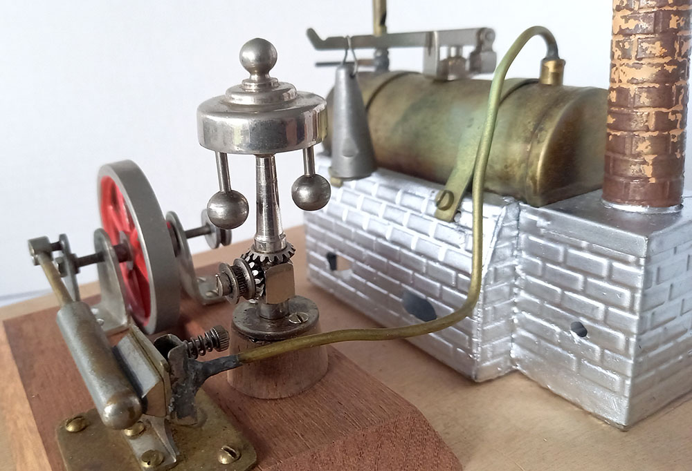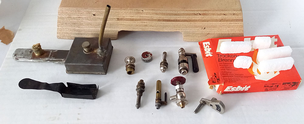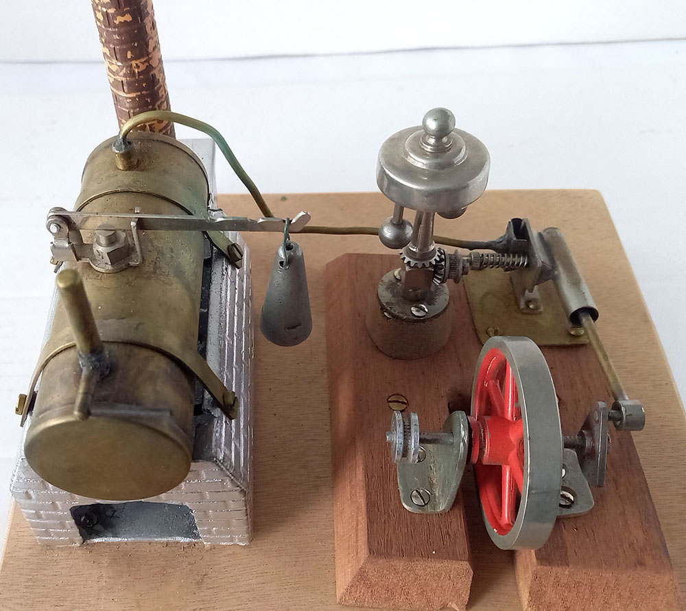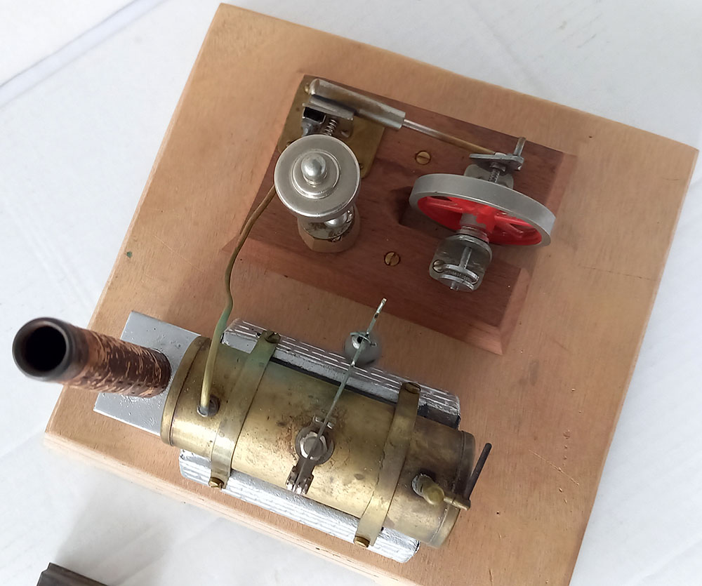 Stoommachine gebouwd op een stuk multiplex. Functie niet getest. Cilinderstang los. Daarbij een aantal onderdelen, zie foto.